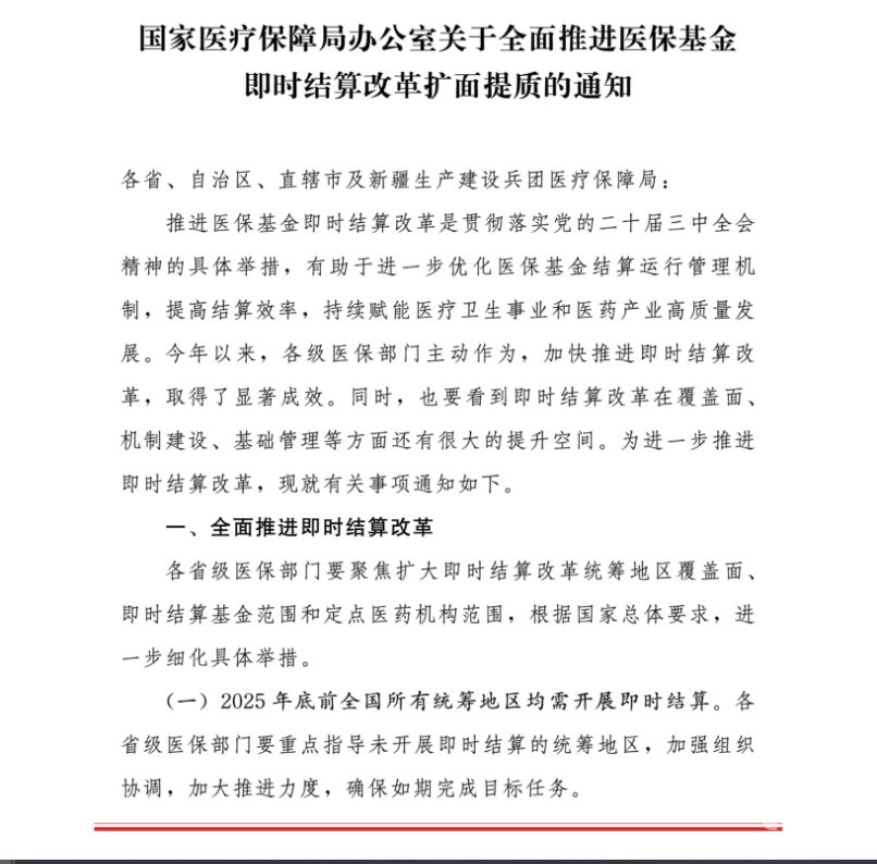 10月16日,國家醫保局辦公室發布了《關于全面推進醫保基金即時結算改革擴面提質的通知》。