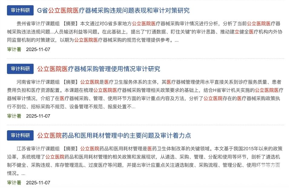 11月7日,審計署官網連發多個圍繞公立醫院審計的科研文章,醫療器械采購為重要關注方向。